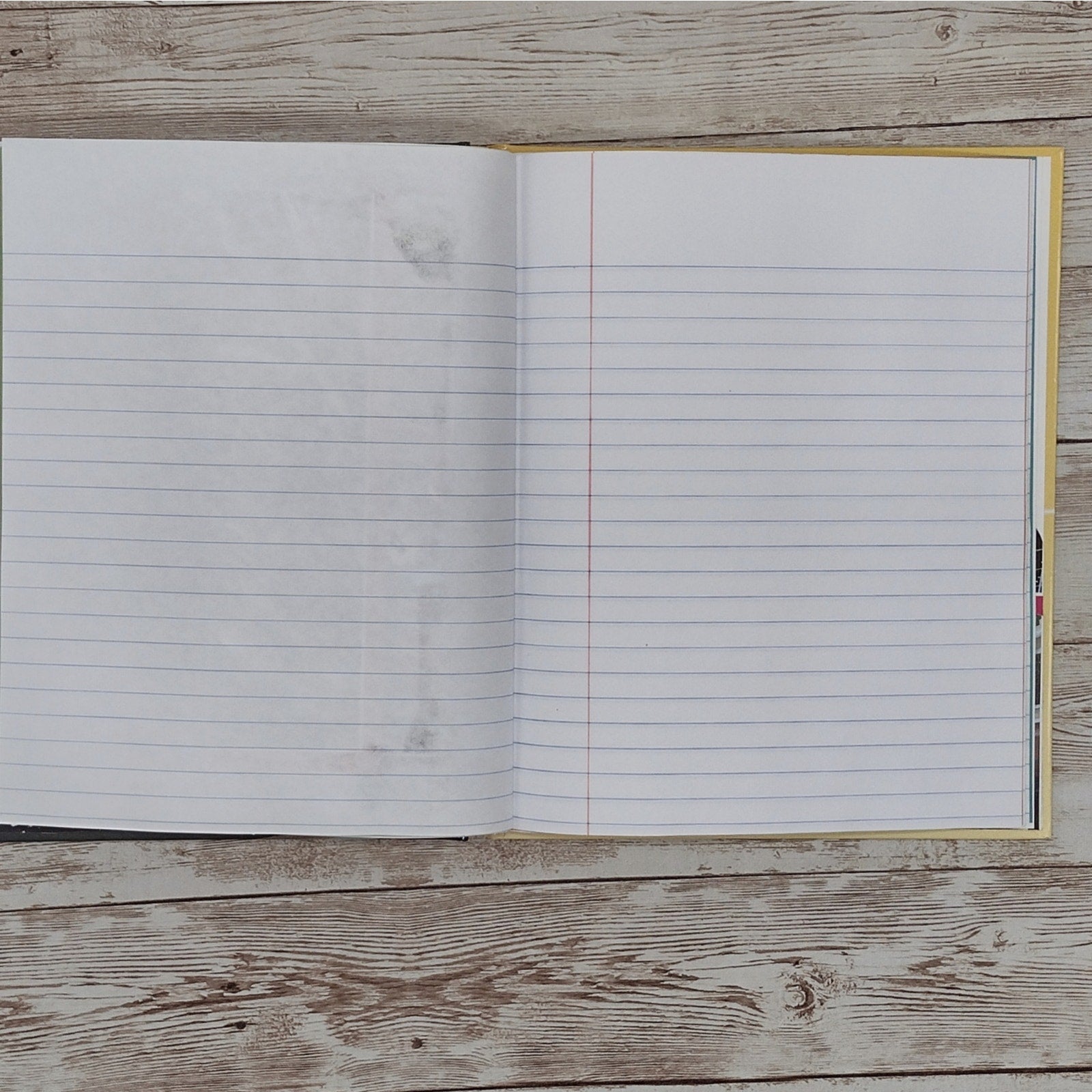 This fun handmade journal has a comic cover with white end pages. It is a one of a kind beauty made using a repurposed book. Some of the original pages are scattered throughout this journal, with others being used as embellishments.