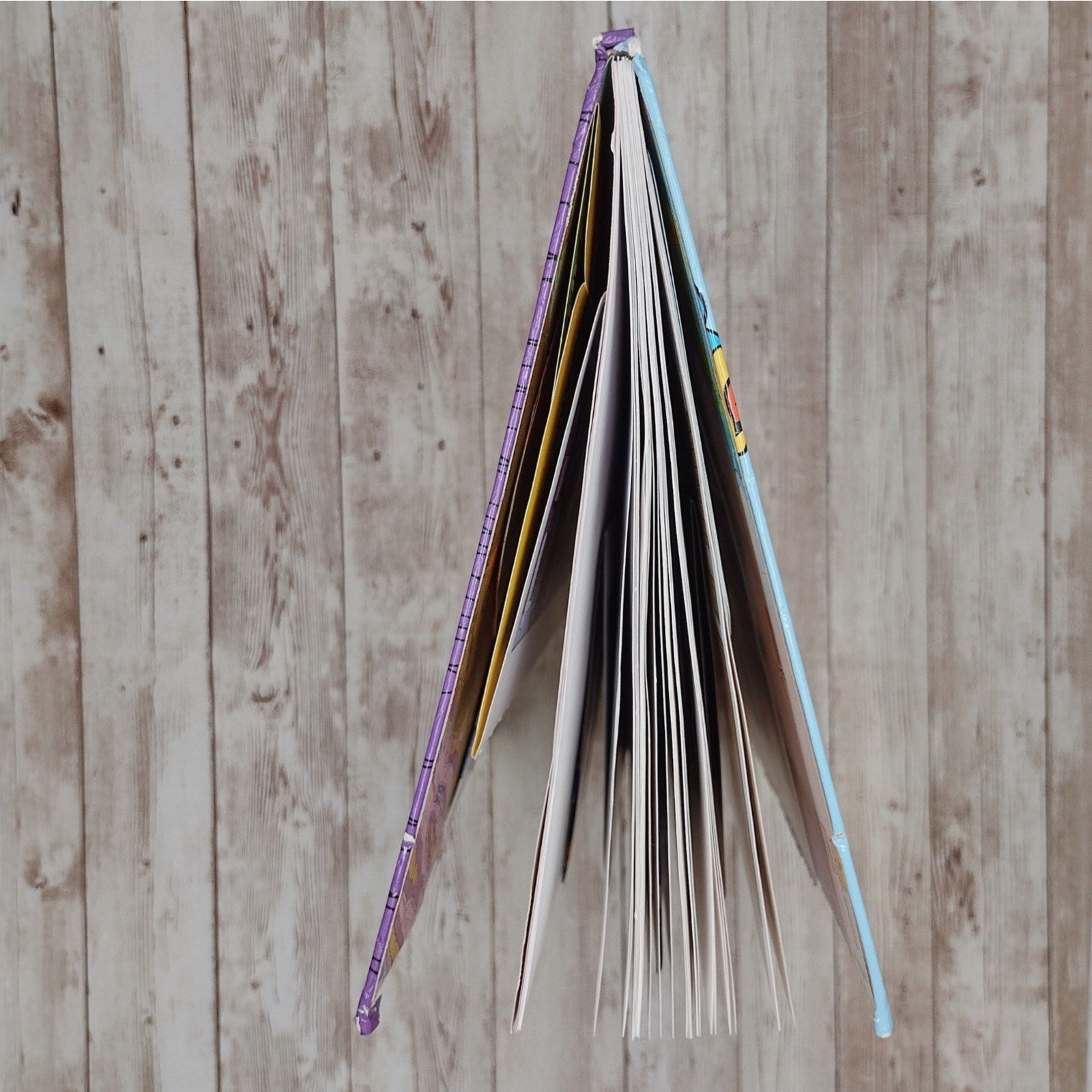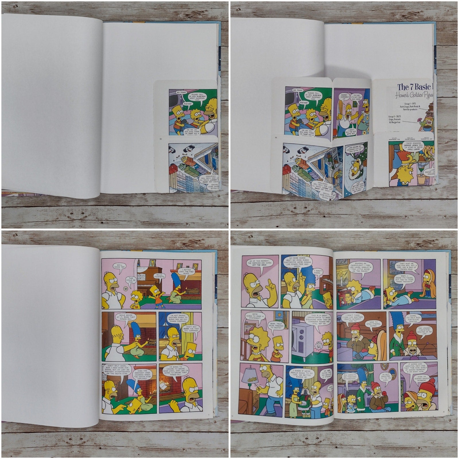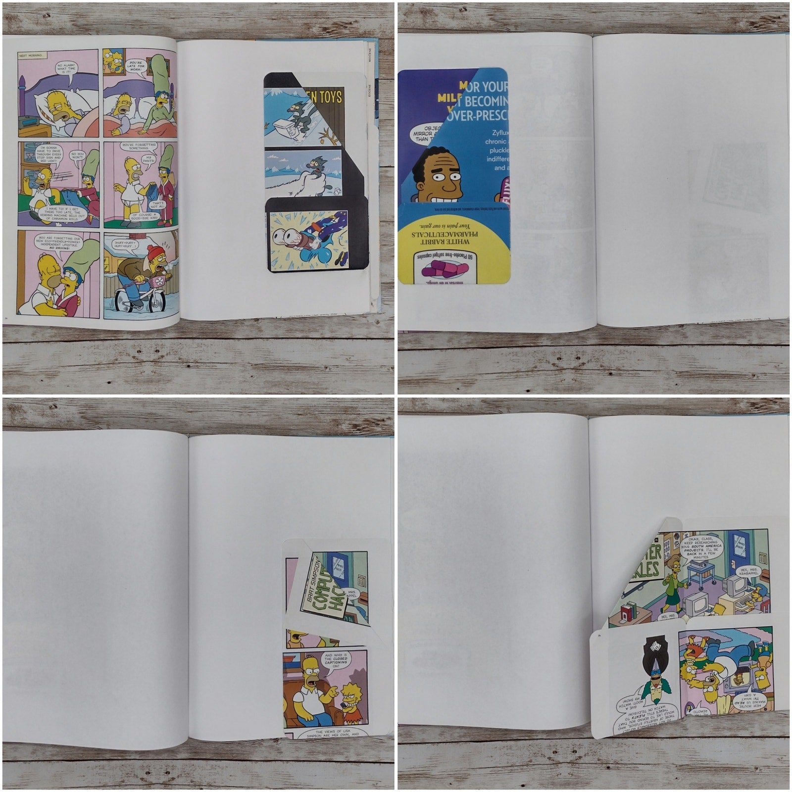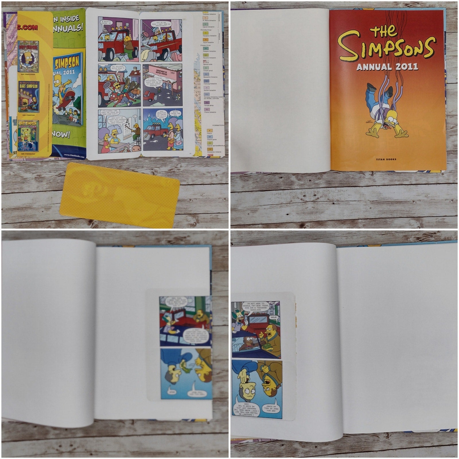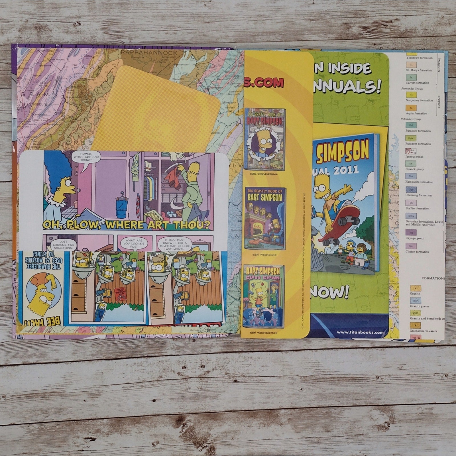 This fun handmade journal has an original Simpsons 2011 Annual cover and map end pages. It is a one-of-a-kind beauty made using a repurposed book. Some of the original pages are scattered throughout this journal, with others being used as embellishments.