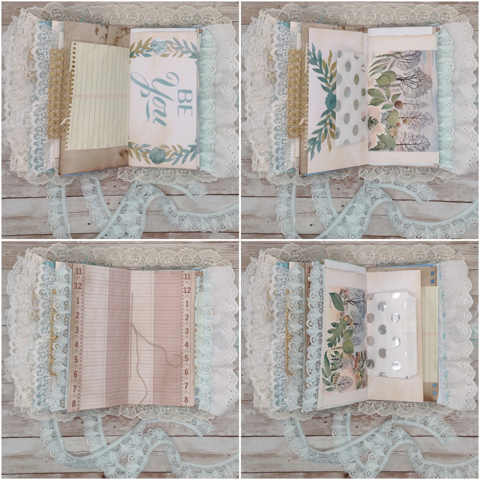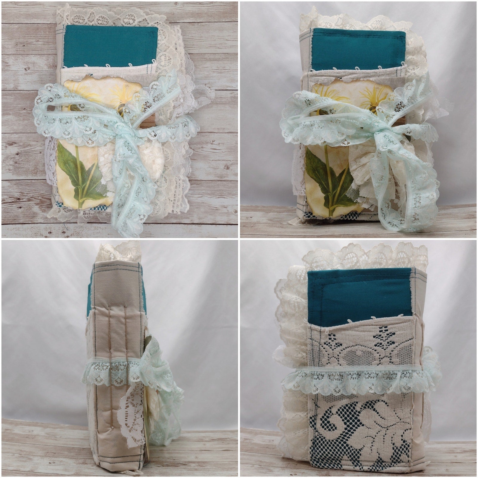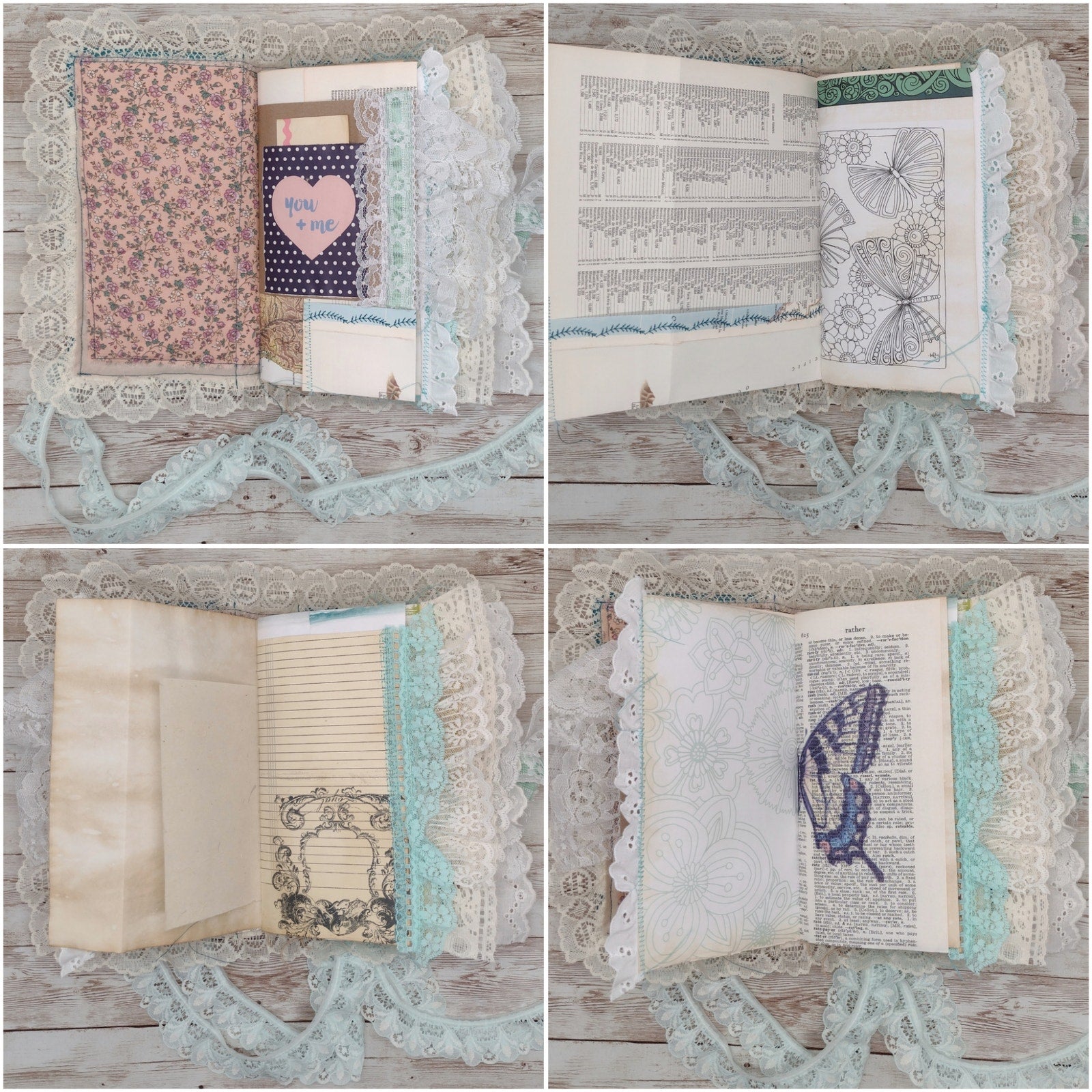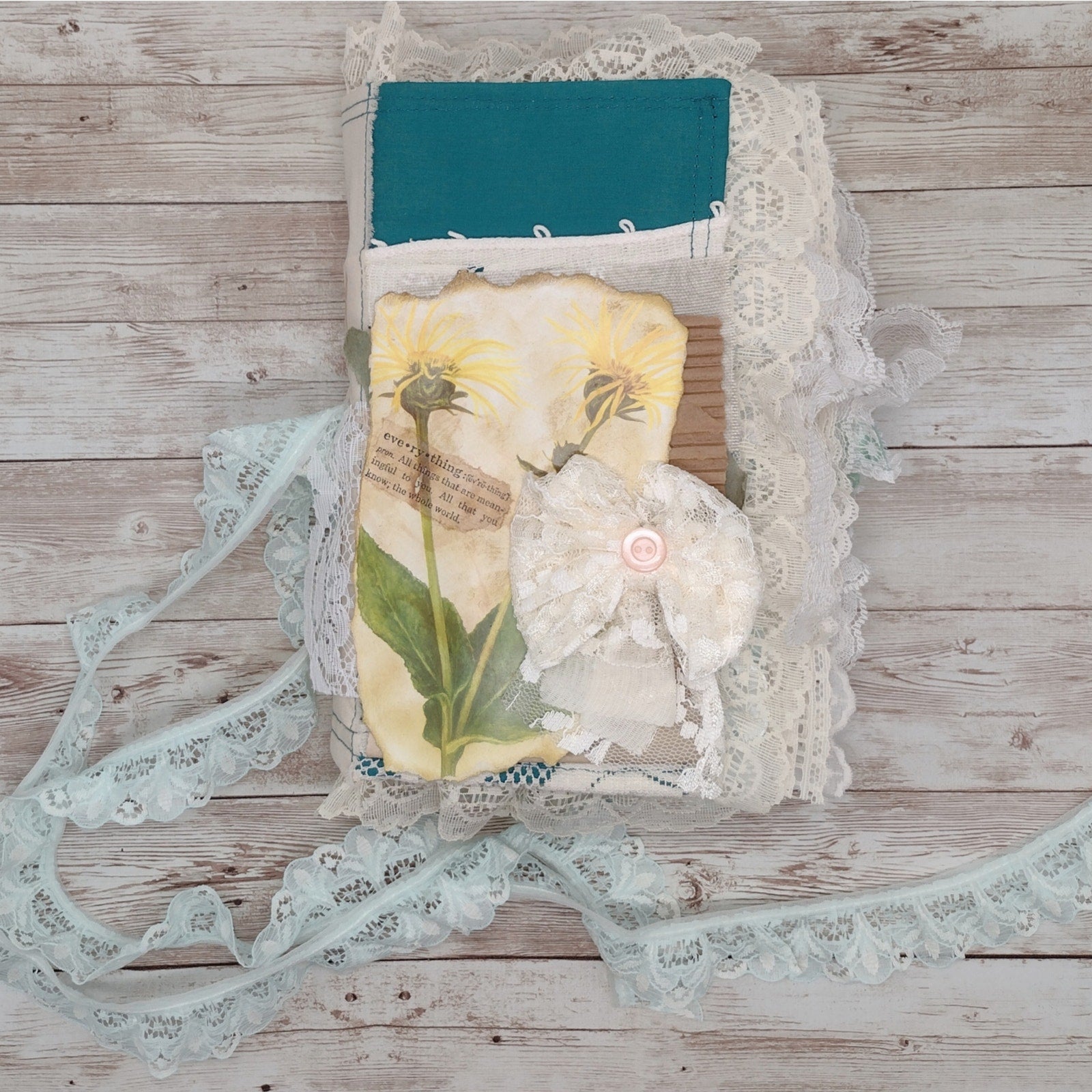 Everything: a turquoise, pink, and purple flower, birds, and butterfly junk journal. This two signature beauty has a handmade fabric cover. It provides a wonderfully unique way to journal for any purpose, scrapbook, or store your keepsakes. This is a lovely way to stay organized while expressing yourself. I don't use kits or templates in my work, ensuring a unique journal you won't find anywhere else.