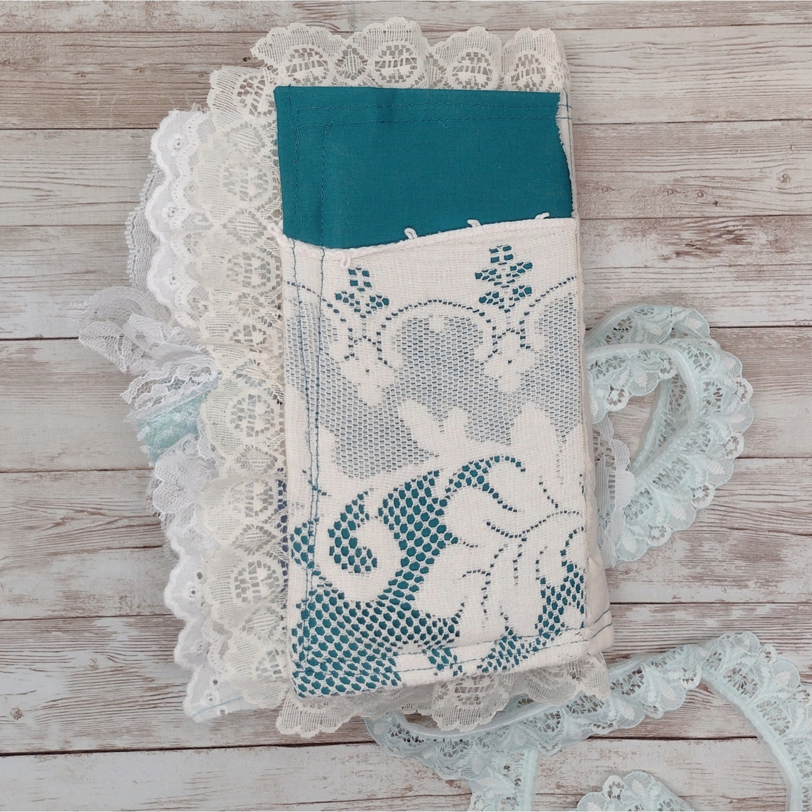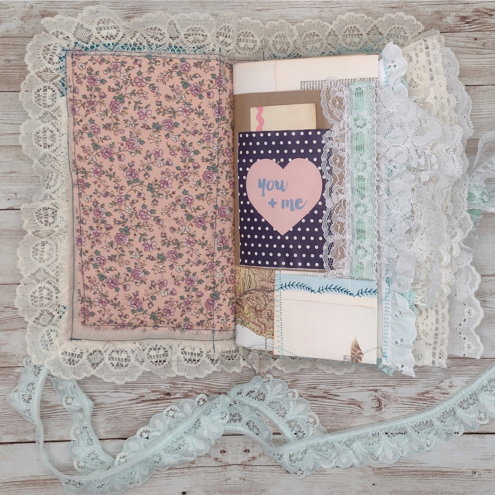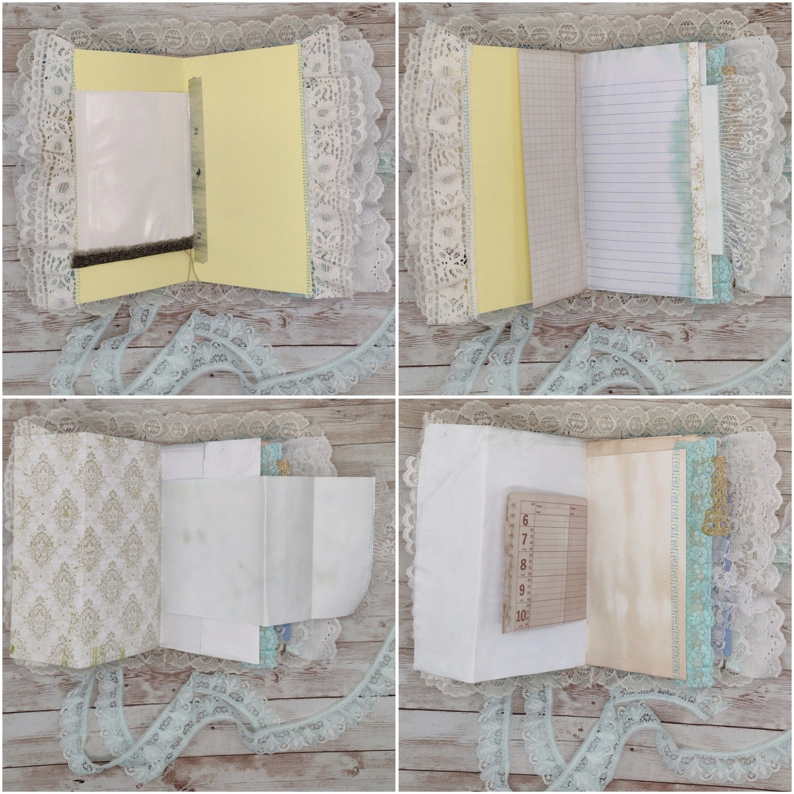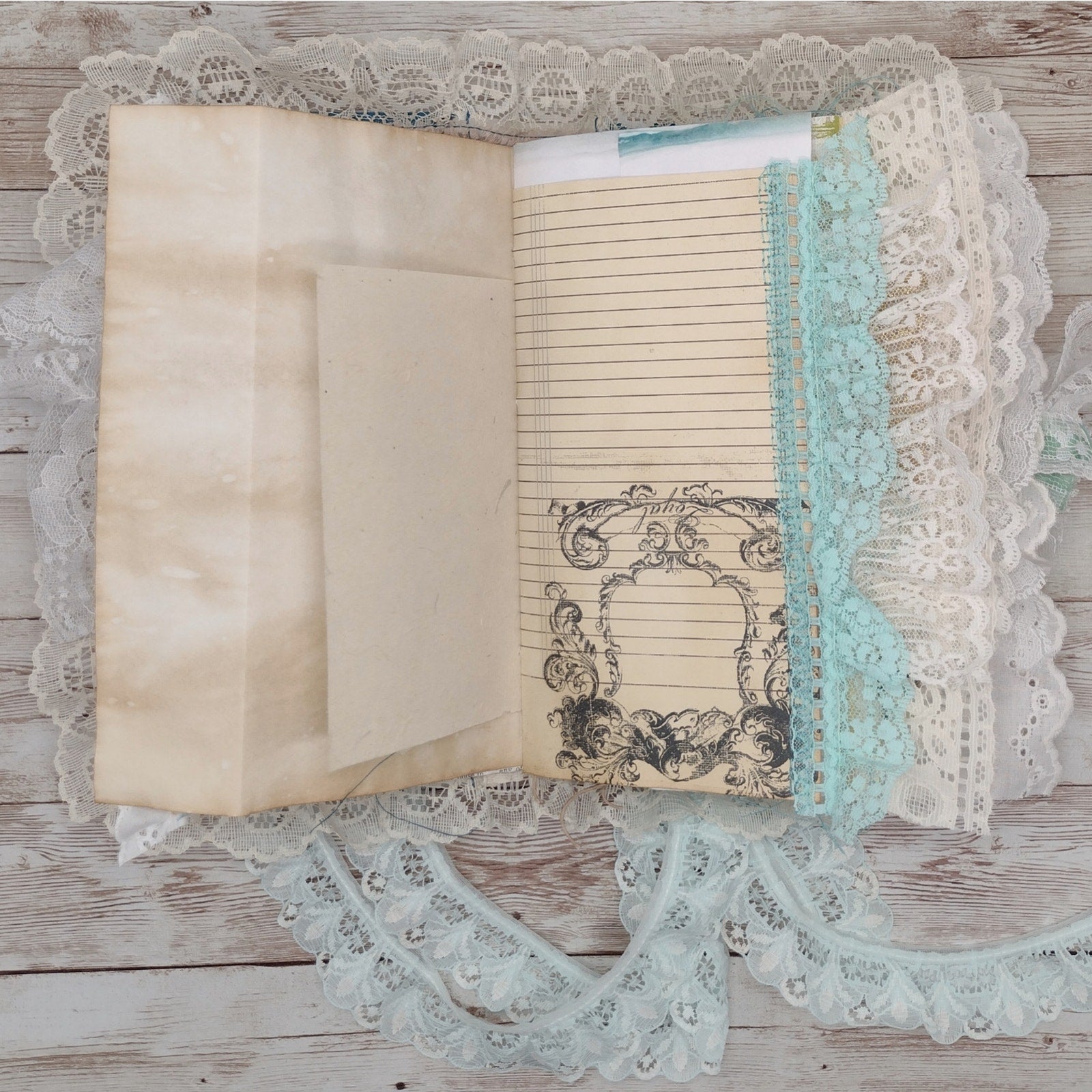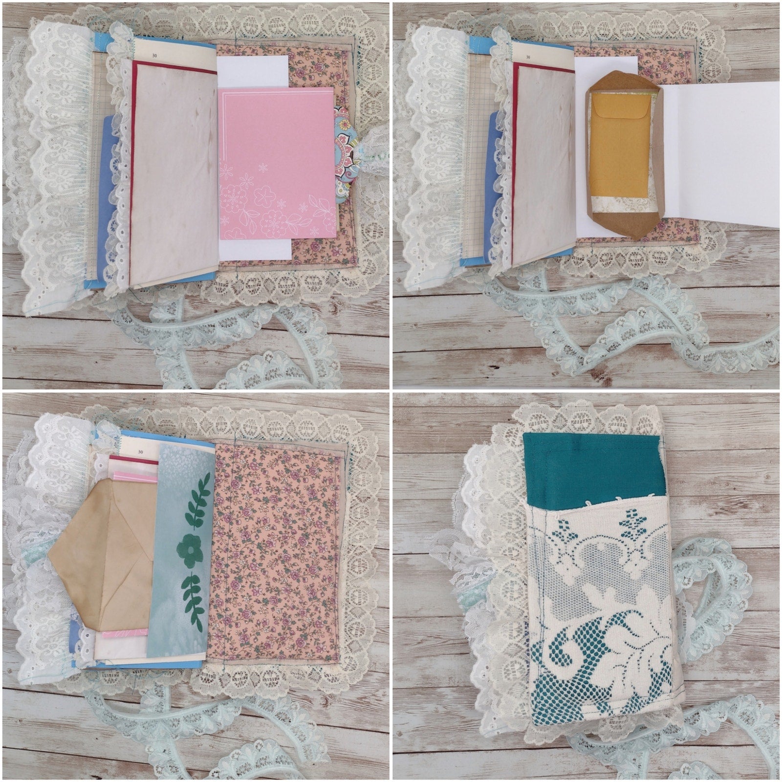 Everything: a turquoise, pink, and purple flower, birds, and butterfly junk journal. This two signature beauty has a handmade fabric cover. It provides a wonderfully unique way to journal for any purpose, scrapbook, or store your keepsakes. This is a lovely way to stay organized while expressing yourself. I don't use kits or templates in my work, ensuring a unique journal you won't find anywhere else.