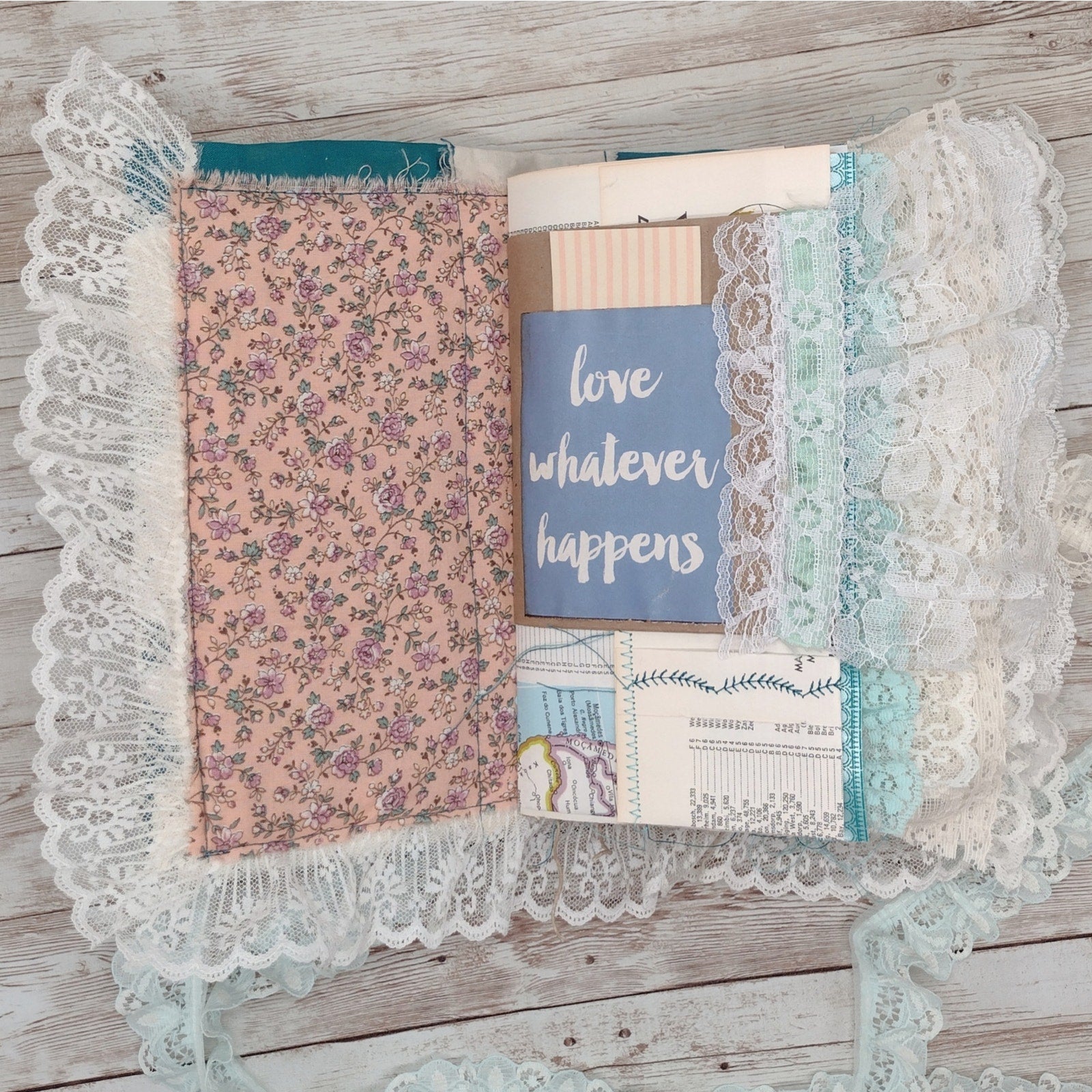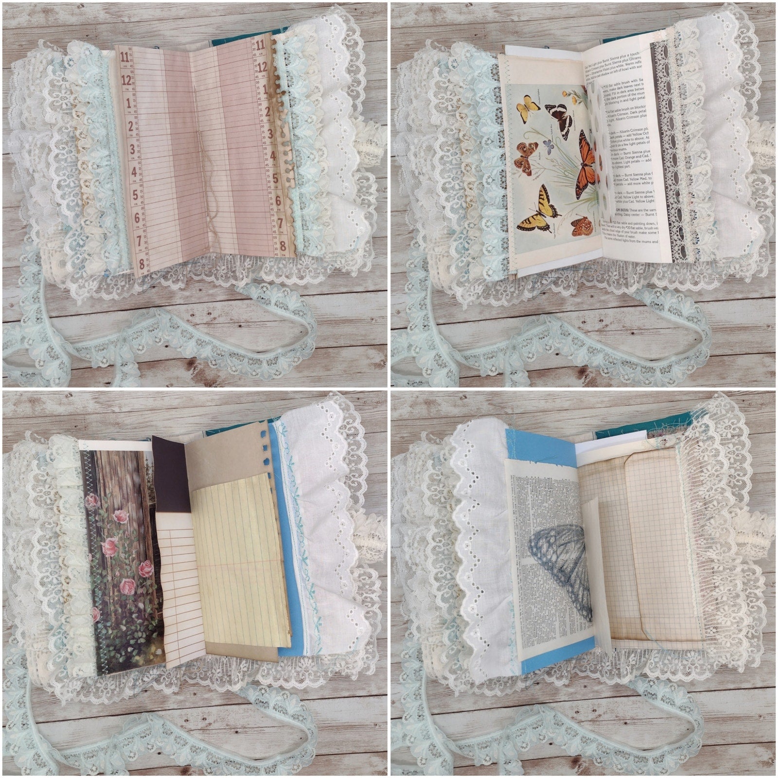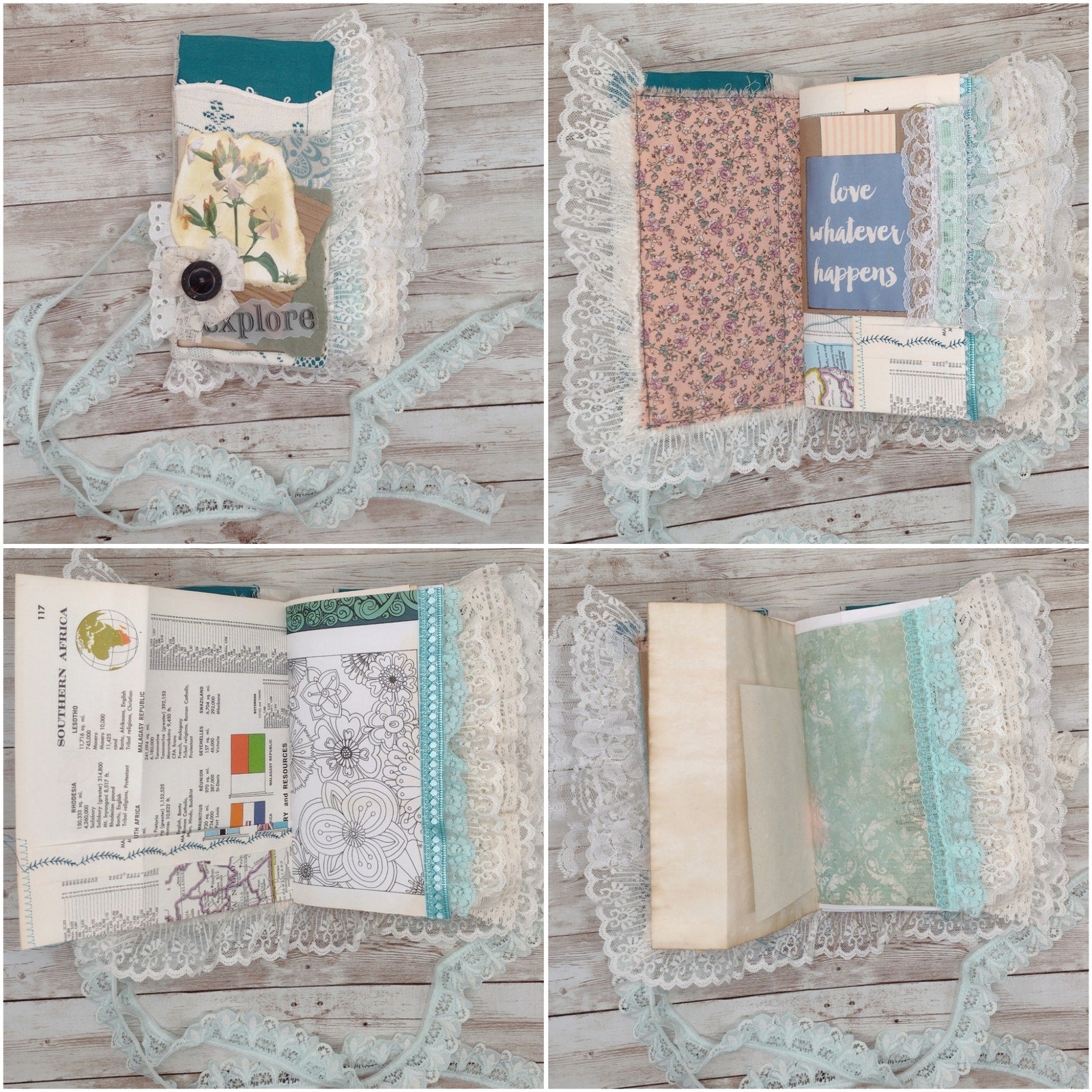 Explore: a turquoise, pink, and purple flower, birds, and butterfly junk journal. This two signature beauty has a handmade fabric cover. It provides a wonderfully unique way to journal for any purpose, scrapbook, or store your keepsakes. This is a lovely way to stay organized while expressing yourself. I don't use kits or templates in my work, ensuring a unique journal you won't find anywhere else.