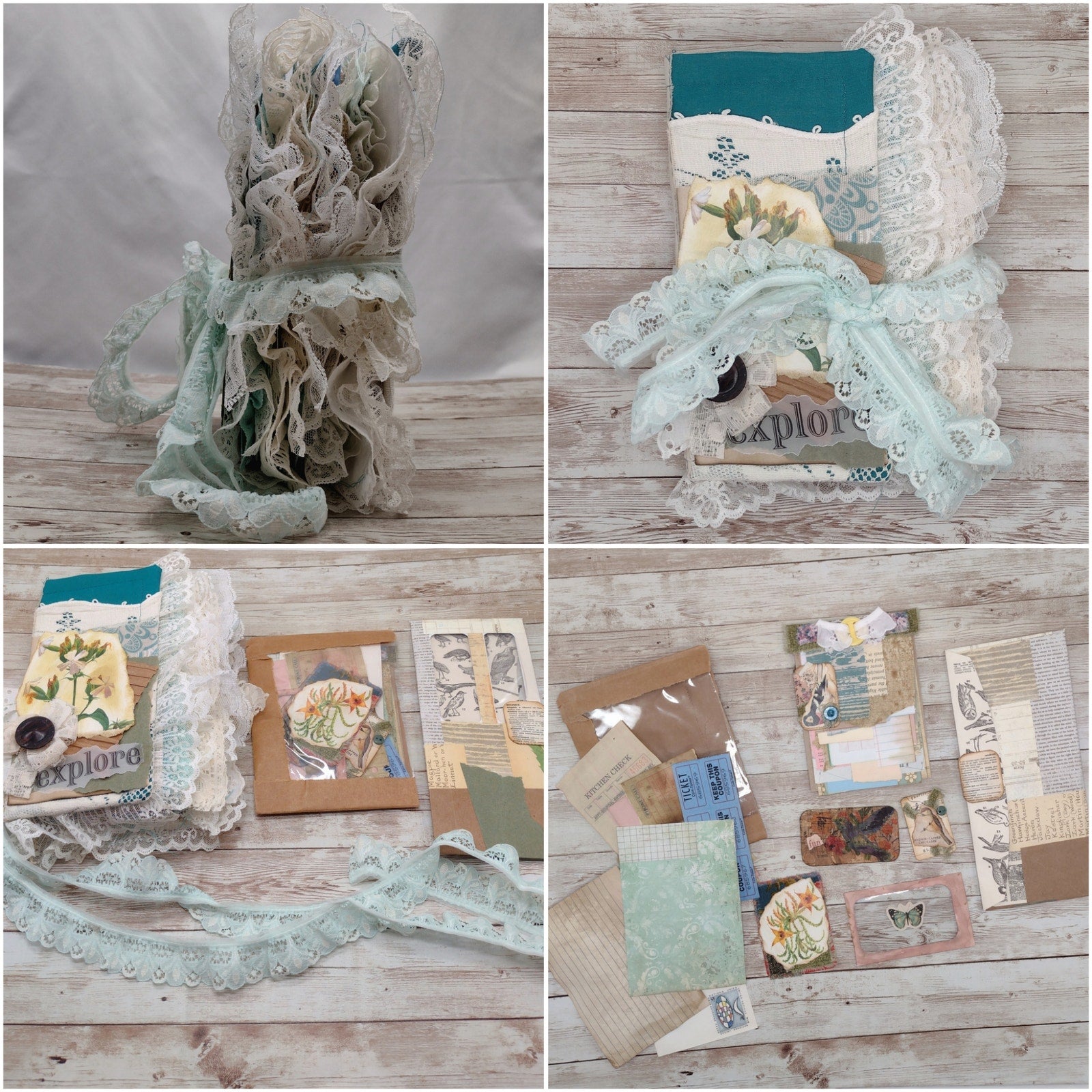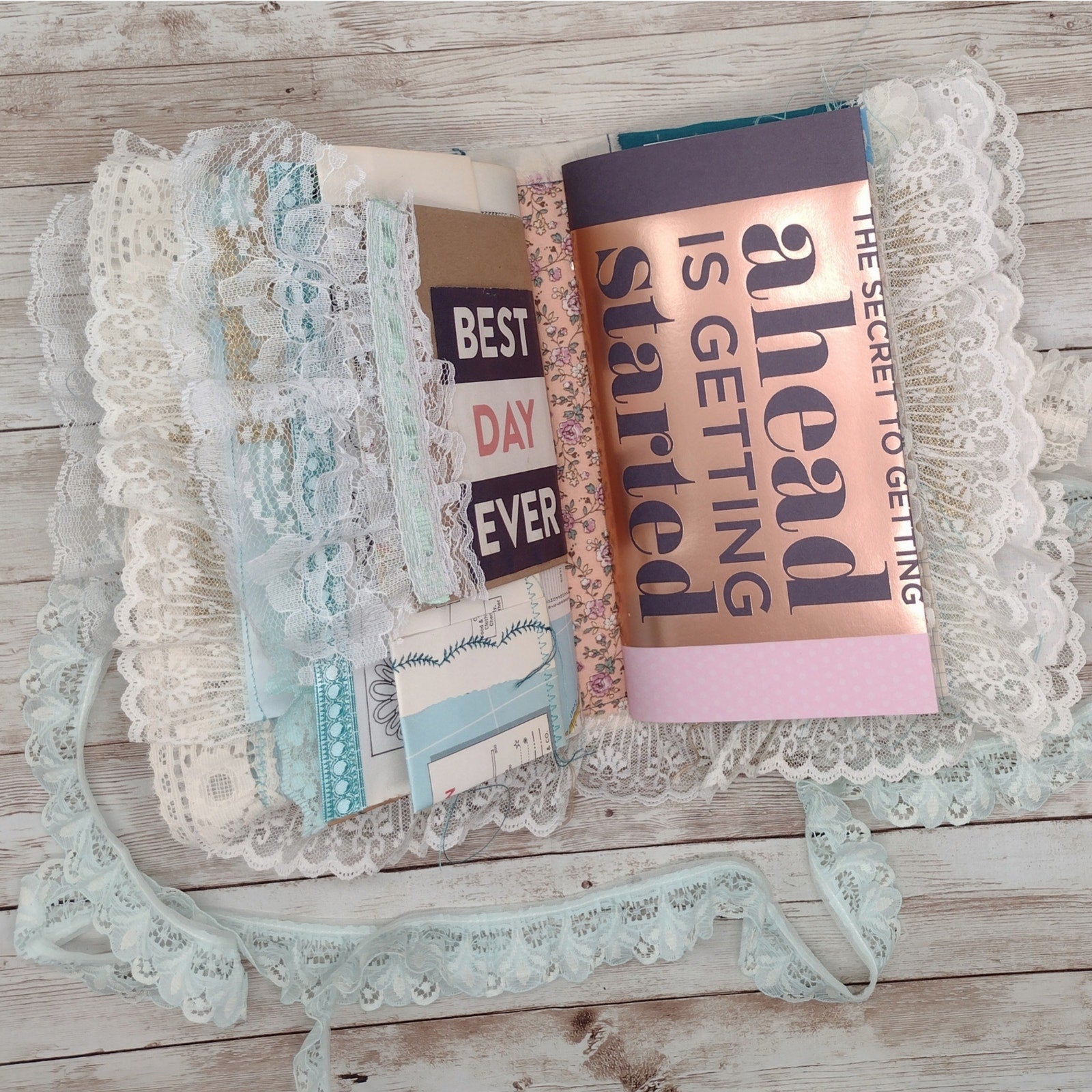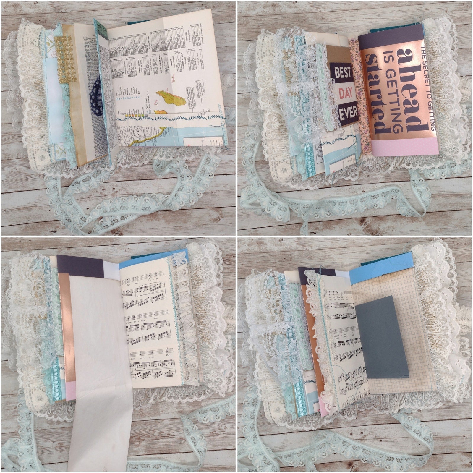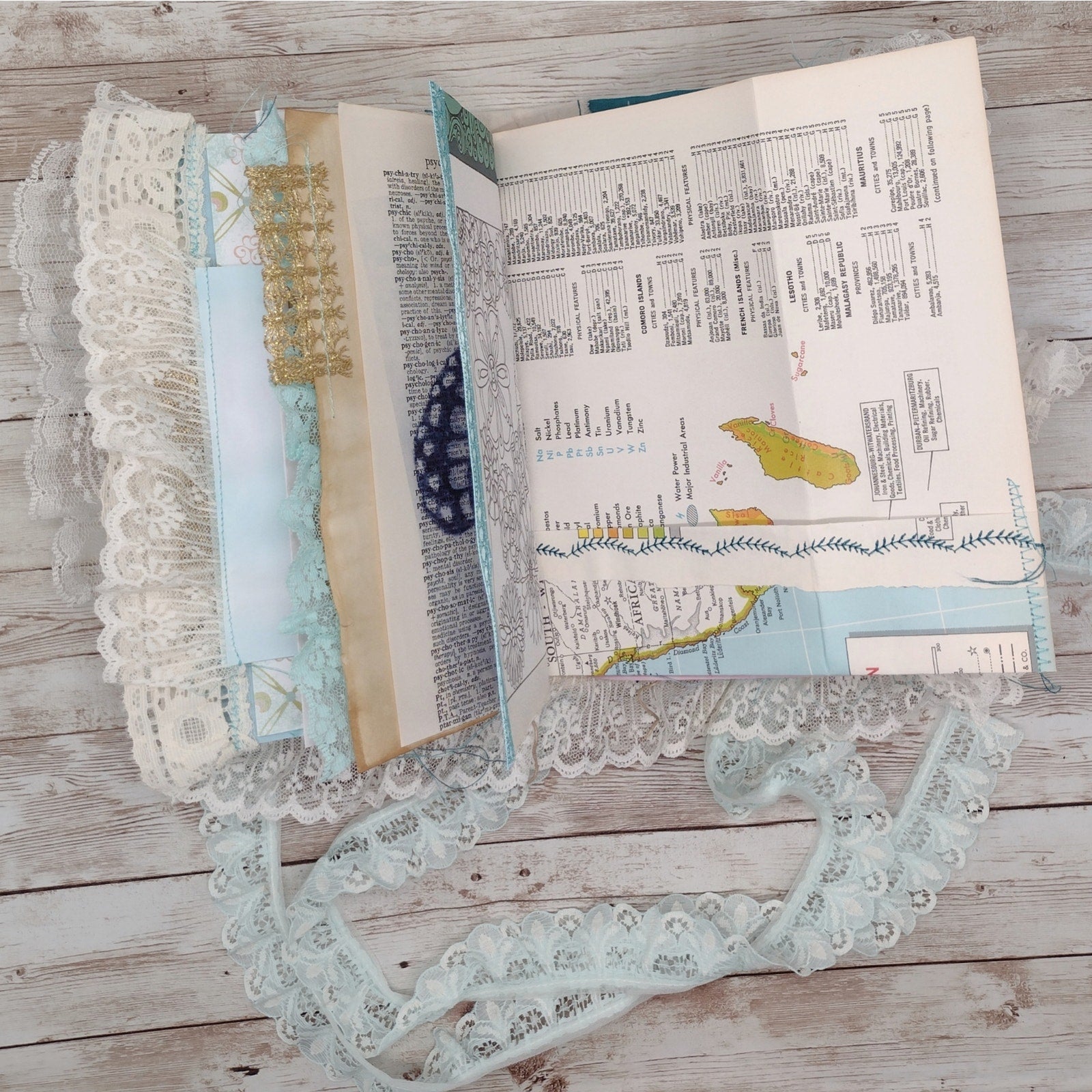 Explore: a turquoise, pink, and purple flower, birds, and butterfly junk journal. This two signature beauty has a handmade fabric cover. It provides a wonderfully unique way to journal for any purpose, scrapbook, or store your keepsakes. This is a lovely way to stay organized while expressing yourself. I don't use kits or templates in my work, ensuring a unique journal you won't find anywhere else.